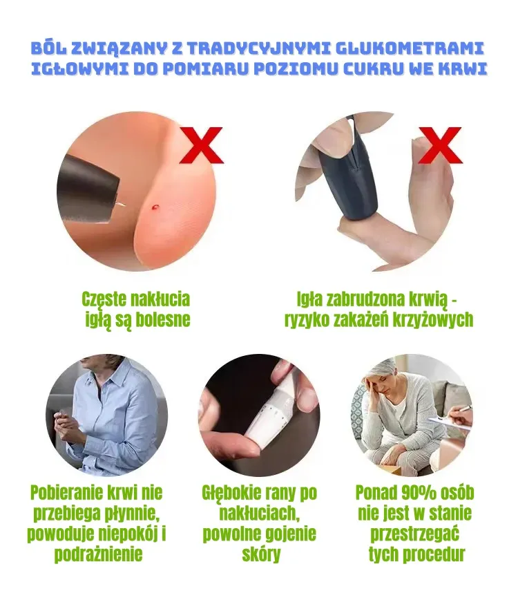 A może unikasz regularnej kontroli zdrowia, bo każdy test jest dla Ciebie nieprzyjemny i męczący?”Tak powstał nasz nieinwazyjny glukometr – z pragnienia przywrócić ludziom spokój i poczucie bezpieczeństwa.Jakie są zagrożenia związane z cukrzycą?